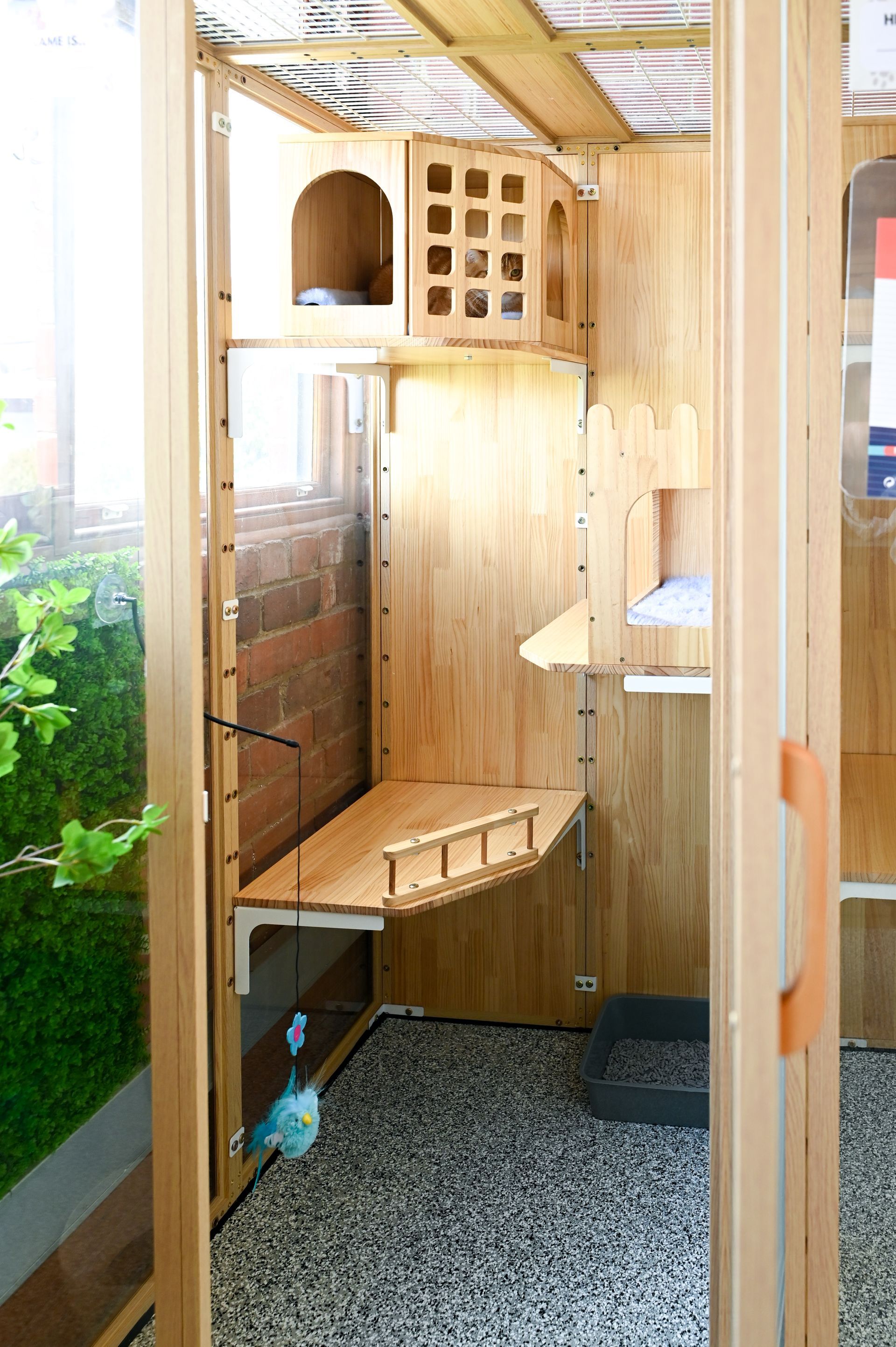 - Comfort & enrichment: Each suite has cozy bedding, climbing shelves, and toys to keep cats happy and entertained.